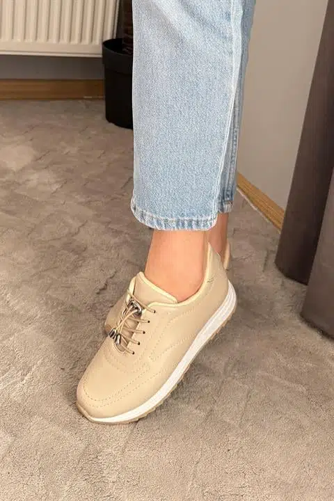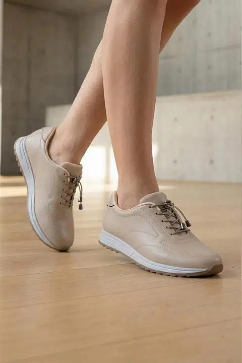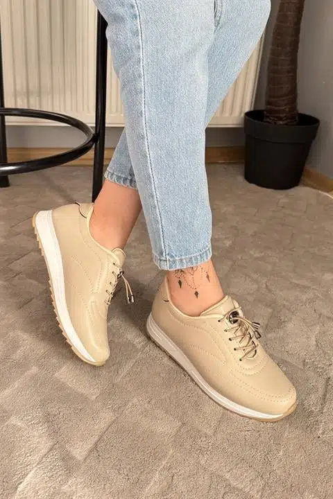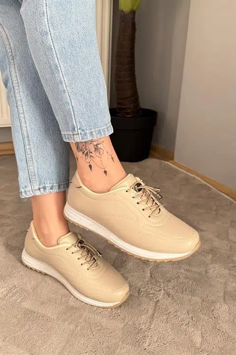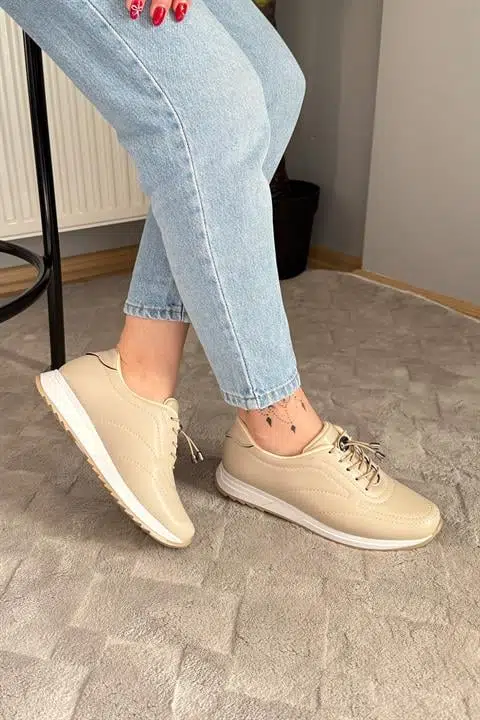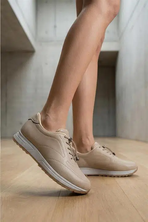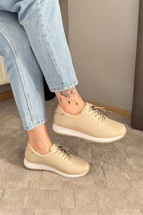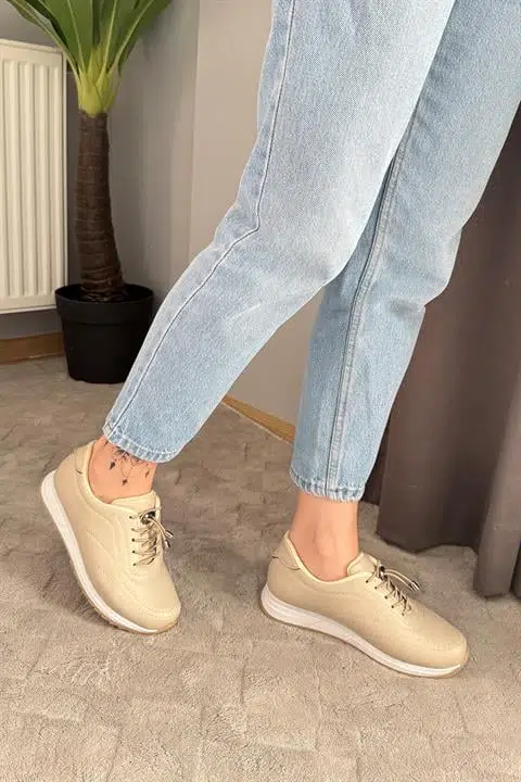 Kadın Ayda Bej Bağcıklı Ortopedik Rahat Tabanı Günlük Babet & Spor Ayakkabı