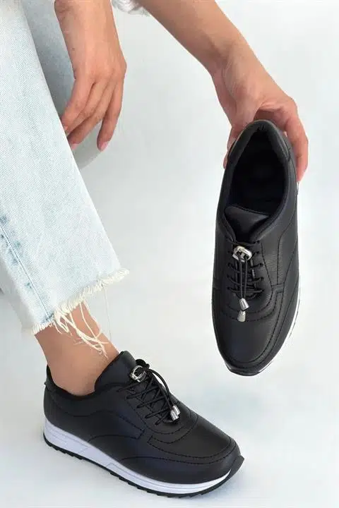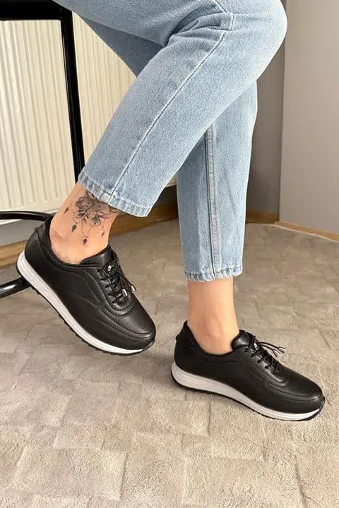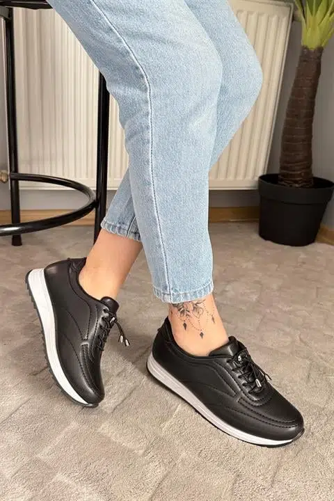 Kadın Ayda Siyah Bağcıklı Ortopedik Rahat Tabanı Günlük Babet & Spor Ayakkabı