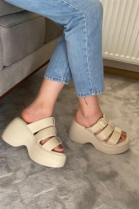 Pola Krem Cilt Arkası Acık Sivri Burun Fiyoklu Detaylı 4 cm Topuklu Ayakkabı
