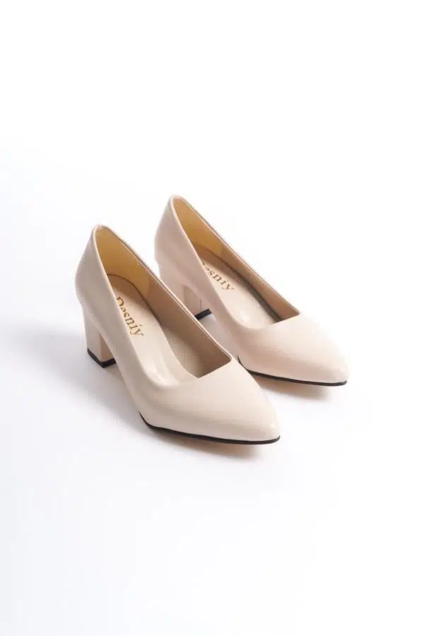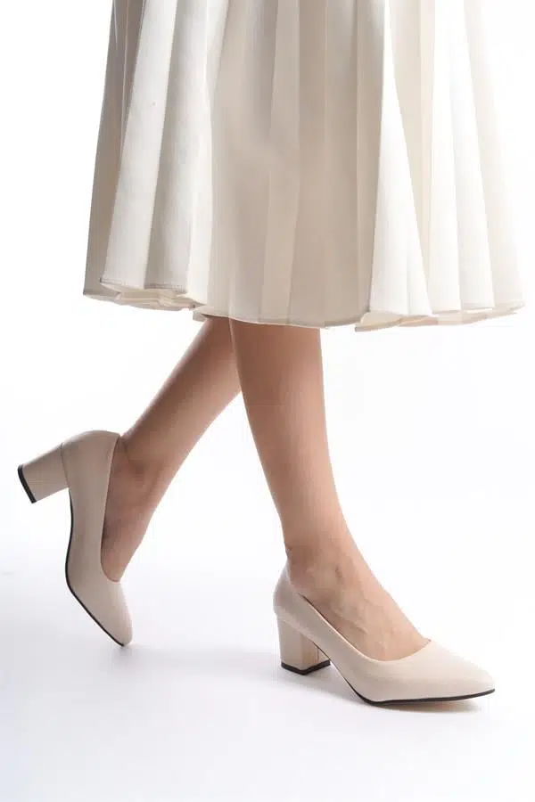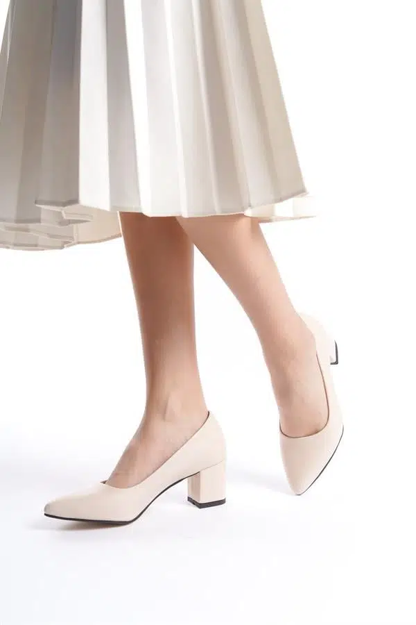 Kadın Camila Krem Deri 6 Cm Kalın Topuklu Hafif Sivri Burunlu Klasık Ayakkabı