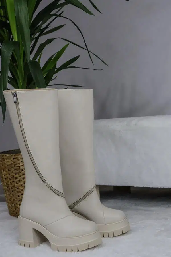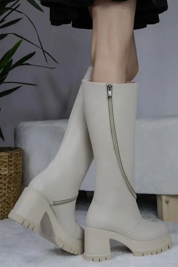 Kadın Carina Krem Cİlt Döner Fermuarlı 8 Cm Platform Topuklu Diz Altı Çizme