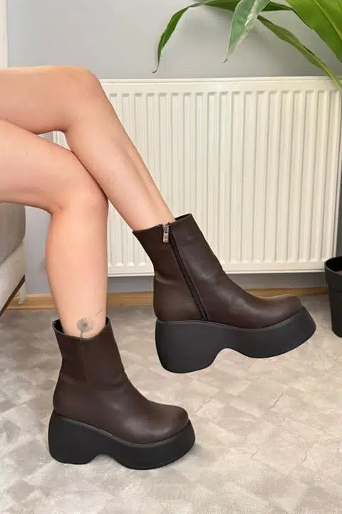Kadın Celsi Kahverengi Deri Yandan Fermuarlı 9 cm Yüksek Dolgu Topuklu Mevsimlik Kadın Kısa Bot Bootie