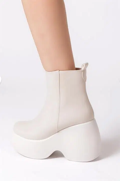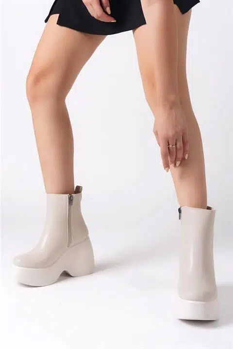 Kadın Celsi Krem Cilt Yandan Fermuarlı 9 cm Yüksek Dolgu Topuklu Mevsimlik Kadın Kısa Bot Bootie