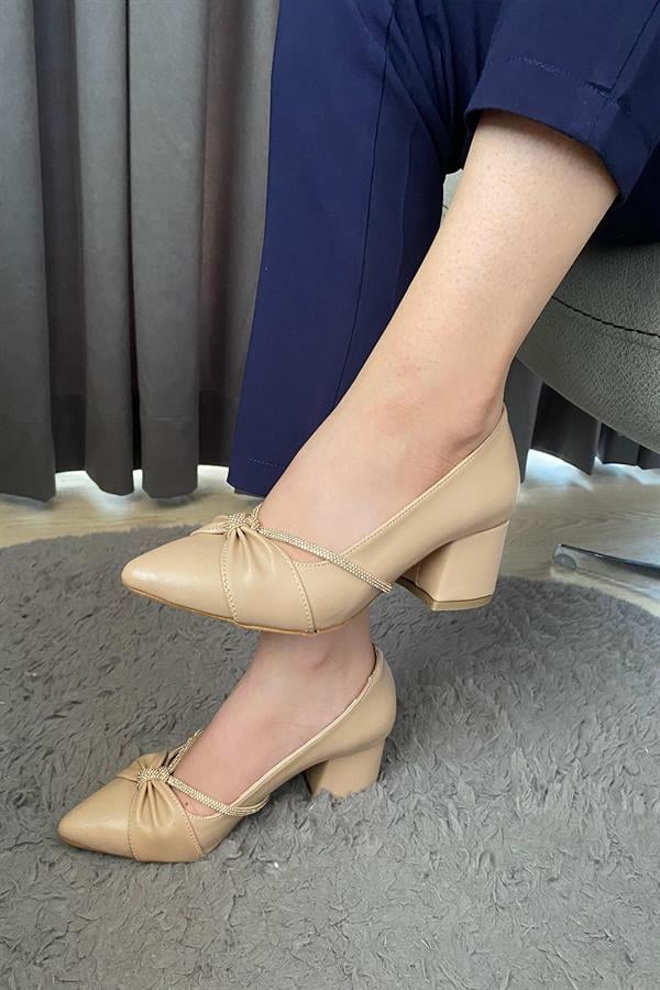 Kadın Cila Ten Taş Fiyonklu 5 cm Kalın Topuklu Ayakkabı