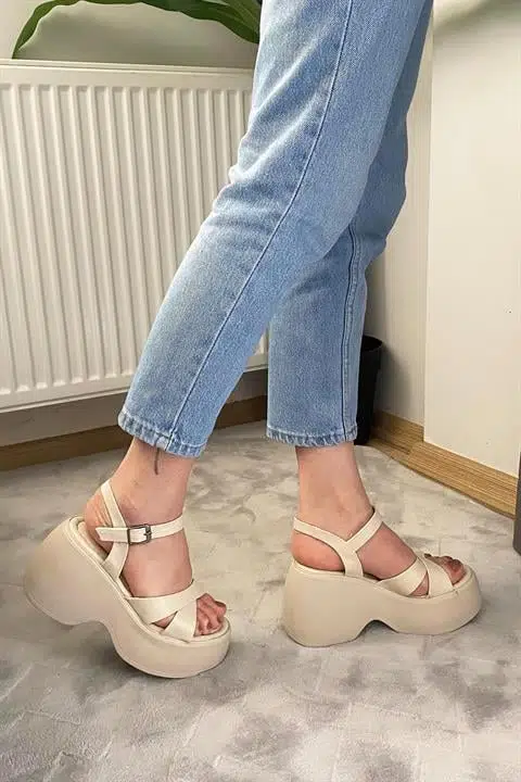 Kadın Dante Bej Çapraz Bantlı Kalın Taban Ortopedik Sandalet K-3000