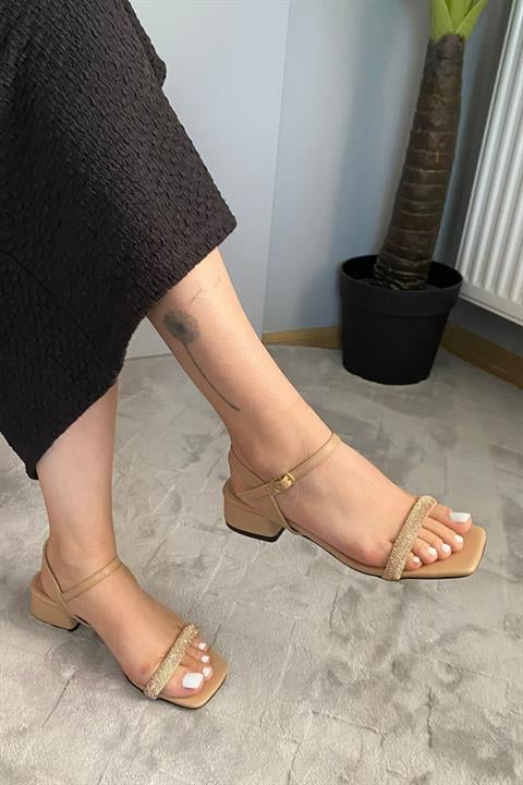 Kadın Natali 9 Krem Cilt Cm Topuklu Ayakkabı Arkası Açık Direkli Tokalı Topuk
