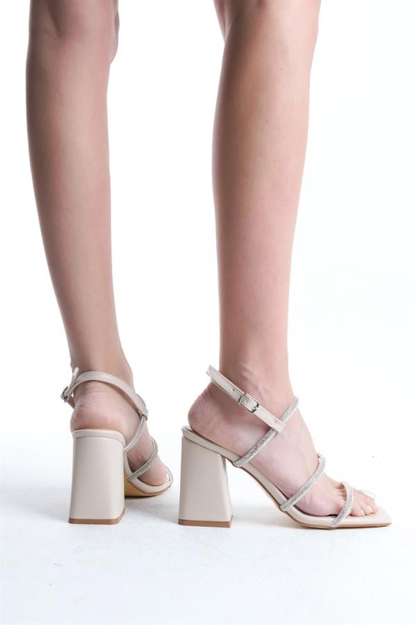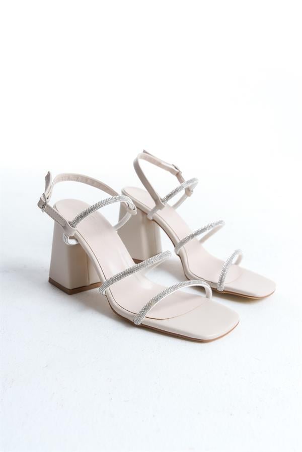 Kadın Eliza Krem Cilt 9 cm Kalın Topuklu Taş Detaylı Aykkabı