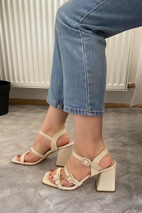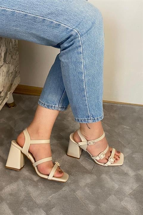 Kadın Fanci Krem Cilt Üç Tokalı 9 cm Kalın Topuklu Aykkabı