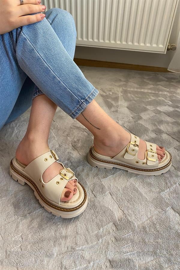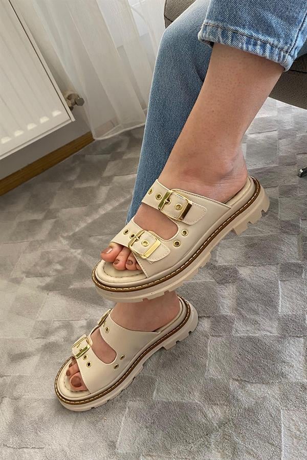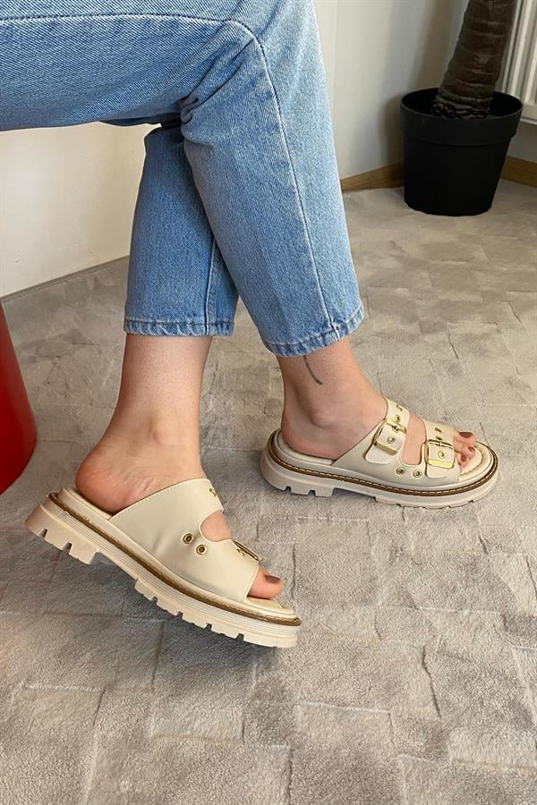 Kadın Desma Beyaz Kafes Model Vardola Deyatlı Kalın Taban Ortopedik Sandalet K-140