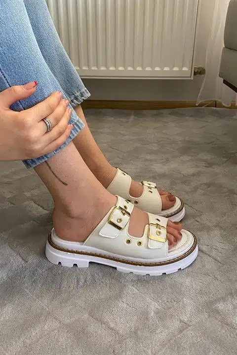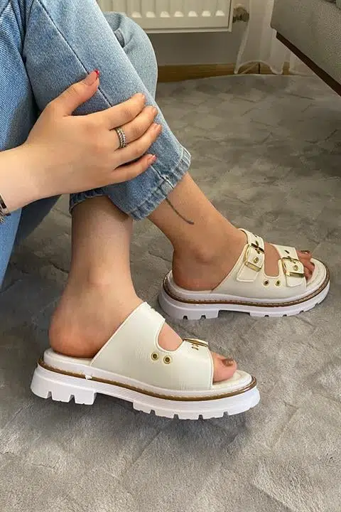 • Ürün Detayı: Yeni Sezon Tabanda Dikiş Detaylı Çift Tokalı Kapsül Detaylı Terlik Sandalet Ortabetik Petli Taban