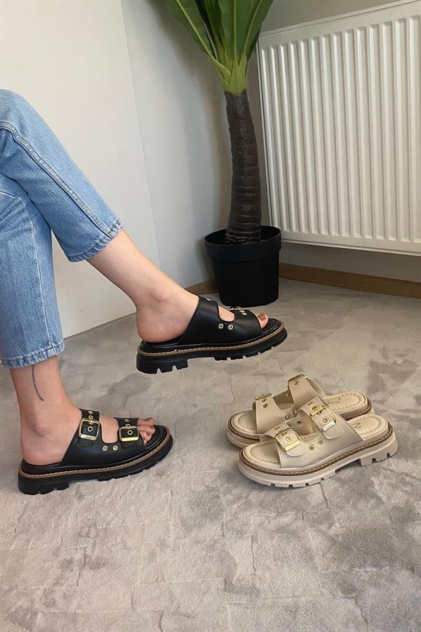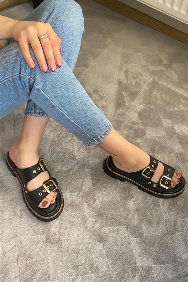 Kadın Holi Siyah Cilt 10 cm Tolgulu Mantar Taban Terlik K-920