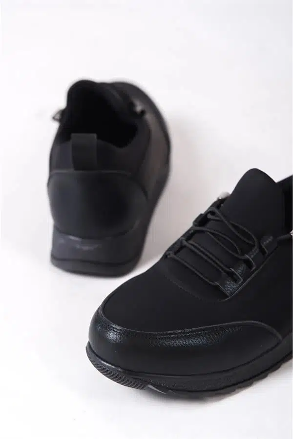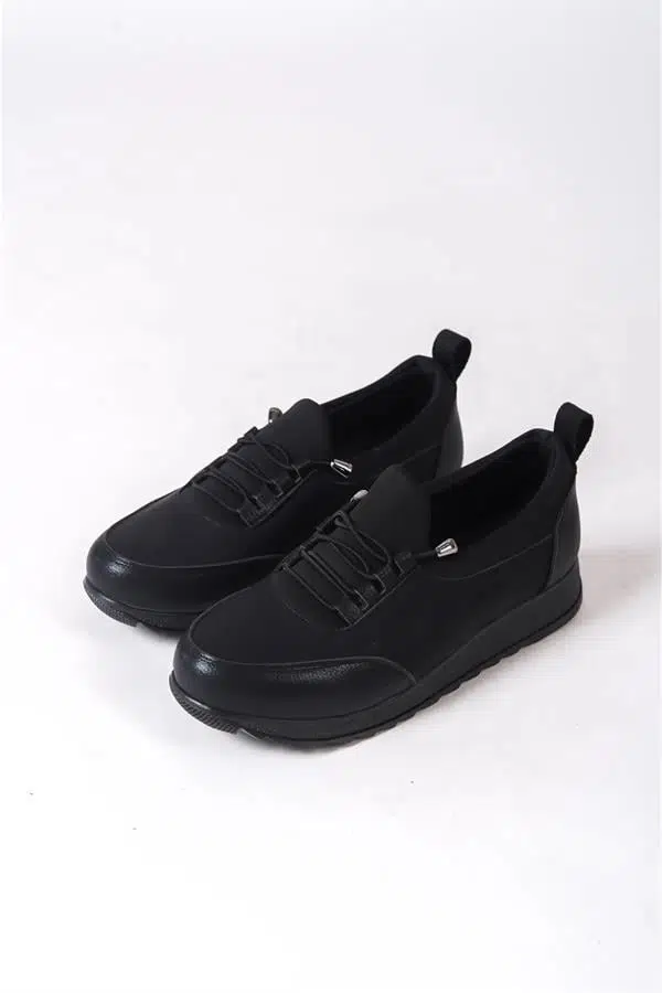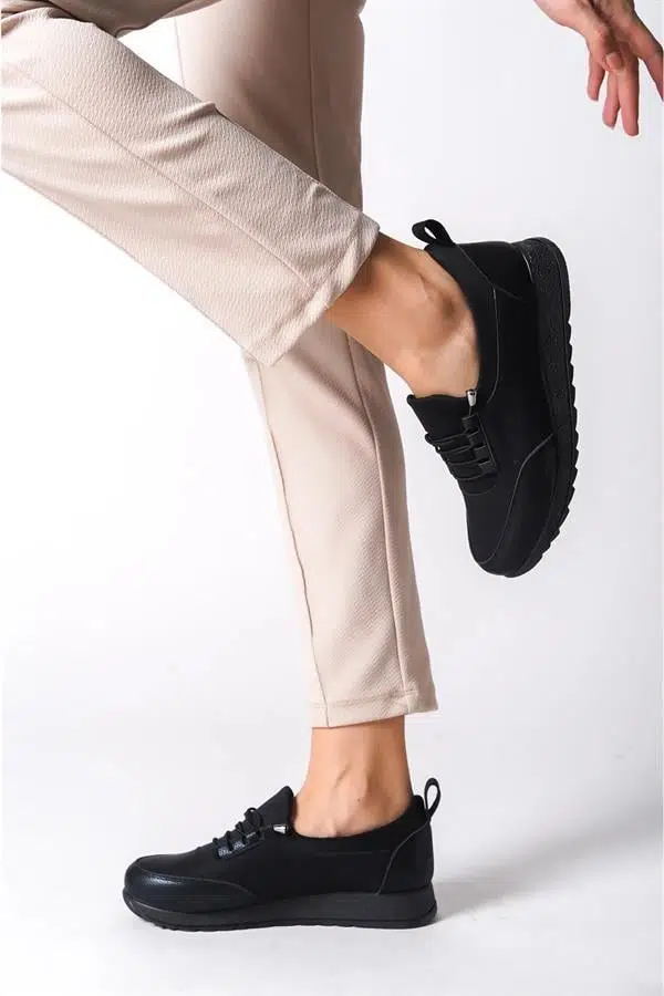 Kadın Galina Siyah Bağcıklı Lastikli Ortopedik Rahat Taban Taş Detaylı Günlük Babet Anne Ayakkabısı