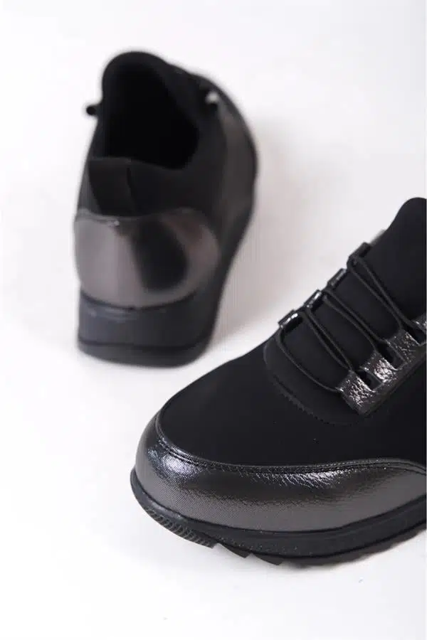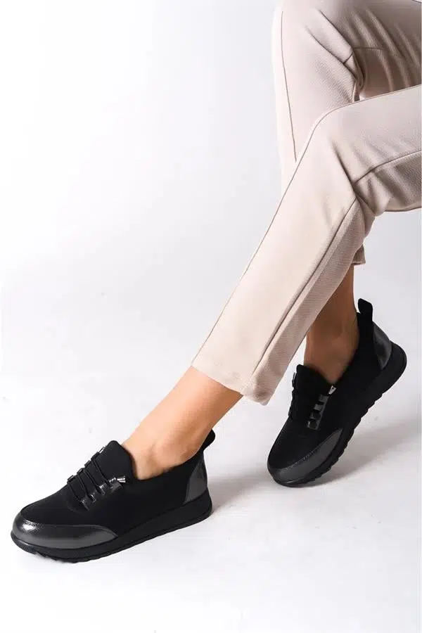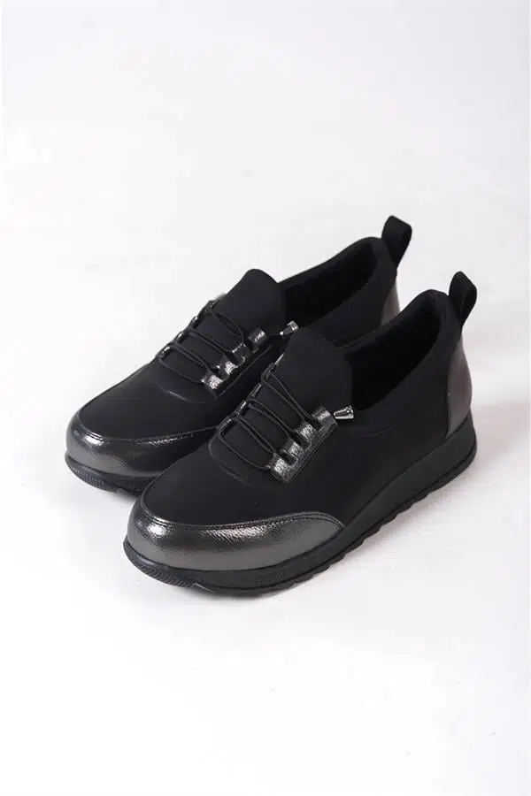 Kadın Galina Siyah Platın Bağcıklı Lastikli Ortopedik Rahat Taban Taş Detaylı Günlük Babet Anne Ayakkabısı