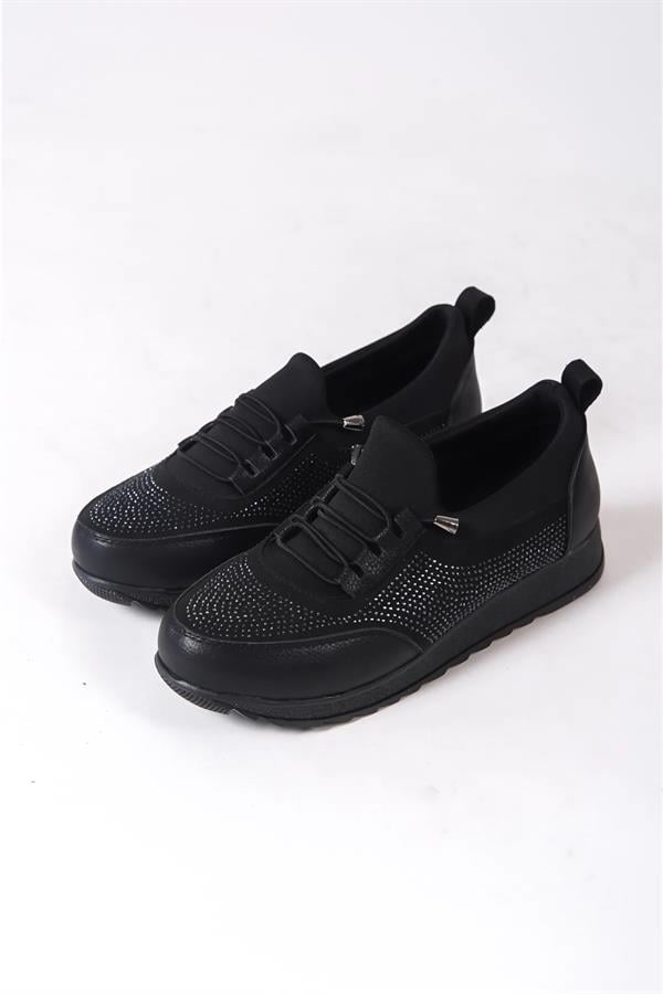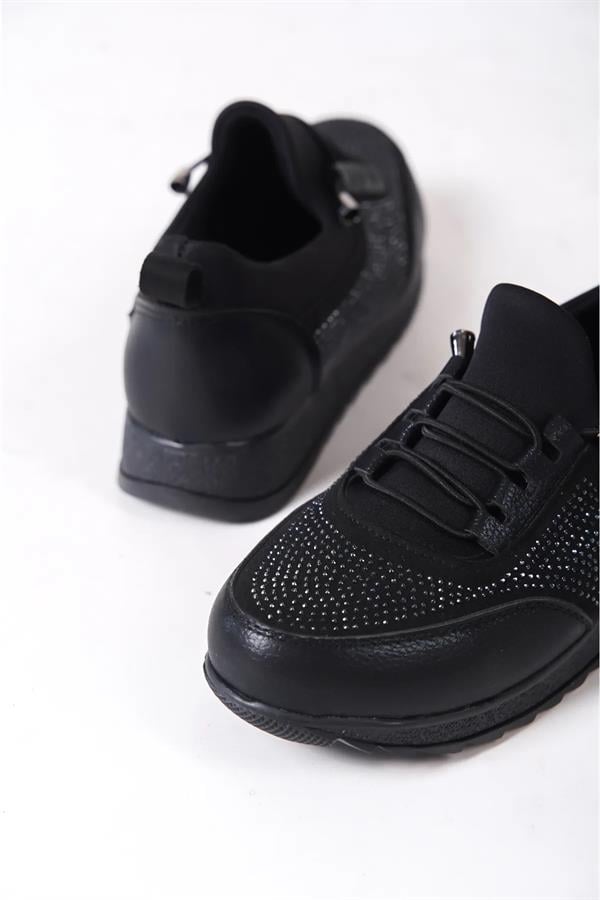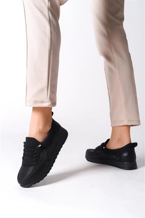 Kadın Galina Siyah Taşlı Bağcıklı Lastikli Ortopedik Rahat Taban Taş Detaylı Günlük Babet Anne Ayakkabısı