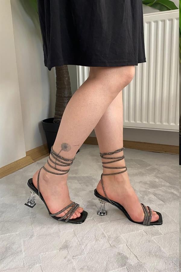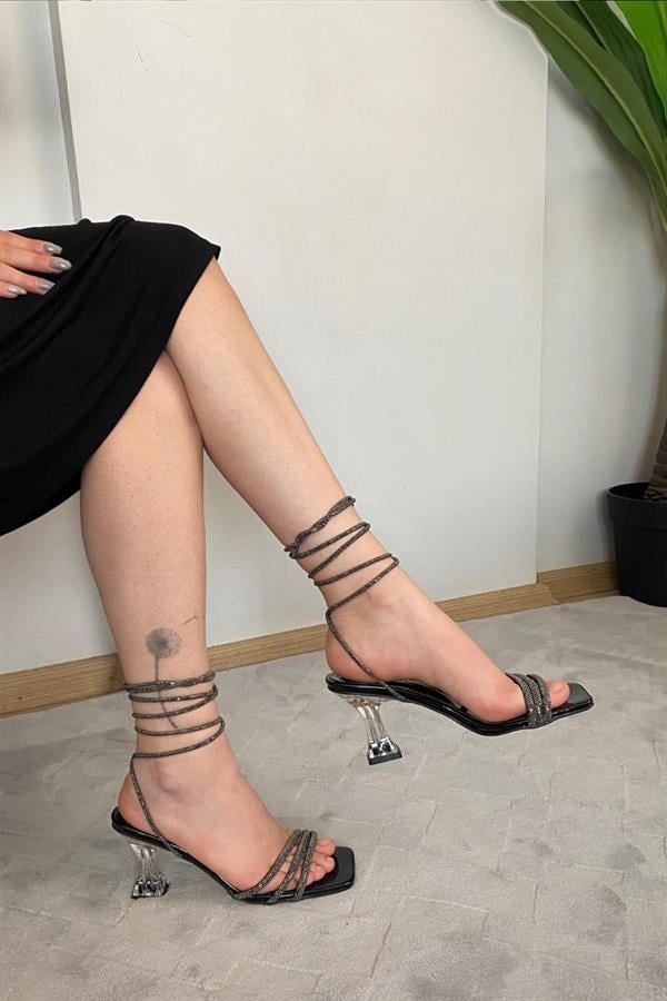 Kadın Gecce Siyah Rugan Taşlı Bilekten Bağlamalı Şeffaf Topuklu Ayakkabı