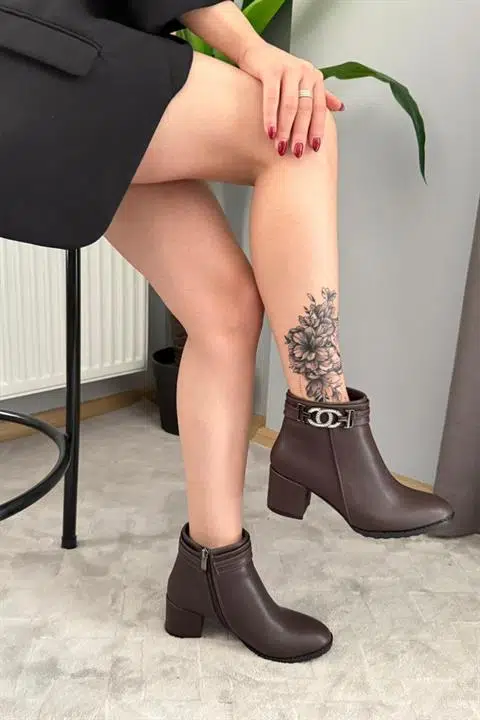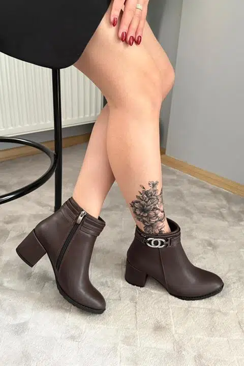 Kadın Hana Kahverengi Taşlı Tokalı ( 6 cm ) Topuklu Oval Burun Bot