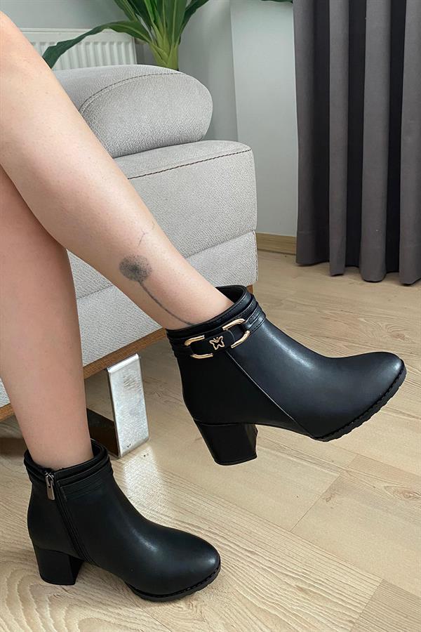 Kadın Hana Siyah Cilt Kelebek Tokalı ( 6 cm ) Topuklu Oval Burun Bot