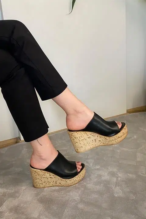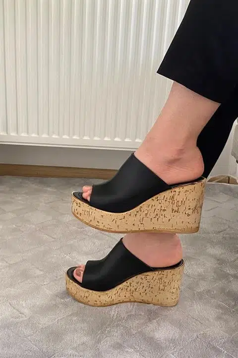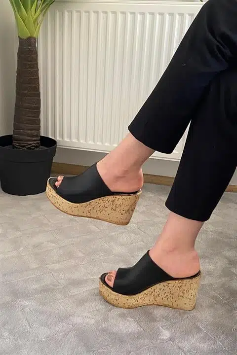 Kadın Holi Siyah Cilt 10 cm Tolgulu Mantar Taban Terlik K-920