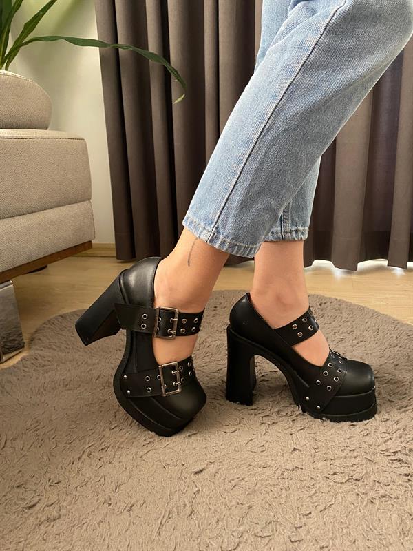 Kadın Guzi Siyah Cilt Tokalı 8 cm Topuklu Platformlu Ayakkabı