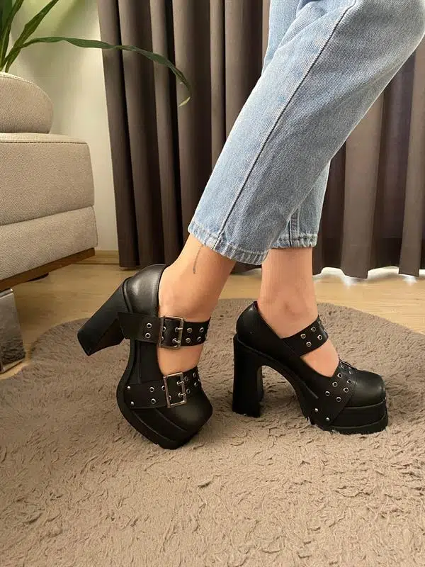 Kadın İzabel Sıyah Deri İki Tokalı Kapsul Detaylı 12 cm Platform Topuklu Ayakkabı