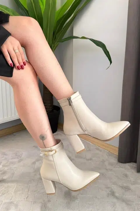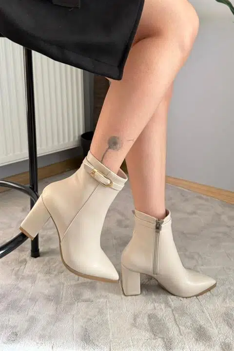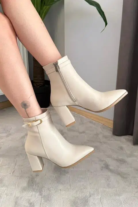 Kadın Julia Bej Deri Yandan Fermuarlı Toka Detaylı Kalın Topuklu Sivri Burunlu Günlük Bot
