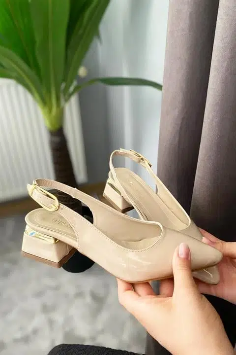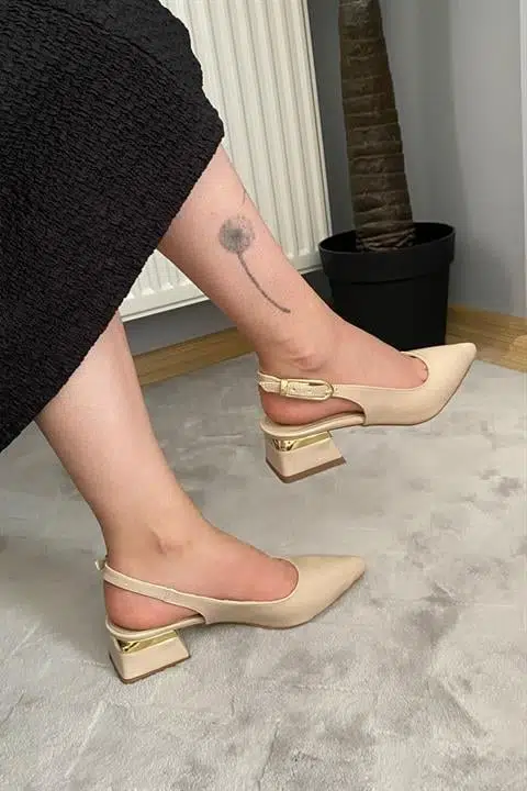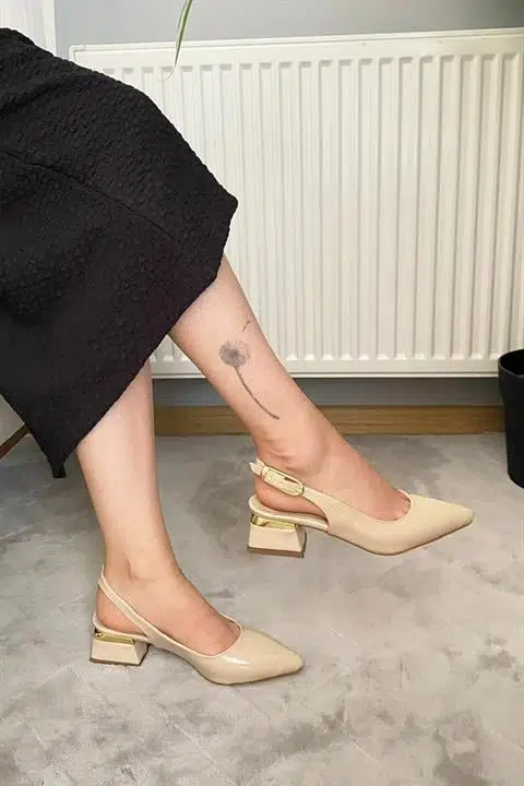 Kadın Karmi Bej Rugan Arkası Acık Sivri Burun 4 cm Kalın Topuklu Ayakkabı
