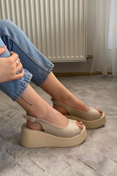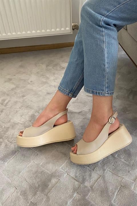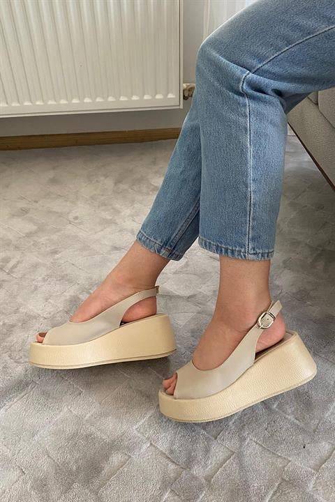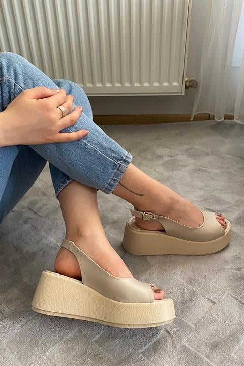 Kadın Mokka Siyah Lastik Detaylı Dolgu Tabanlı Sandalet