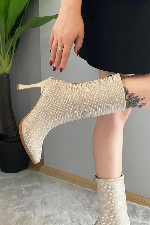 Kadın Londen Bej Süet Gümüş Taş İşlemeli 9 cm İnce Topuklu Arkadan Fermuarlı Kısa Çizme-Bot