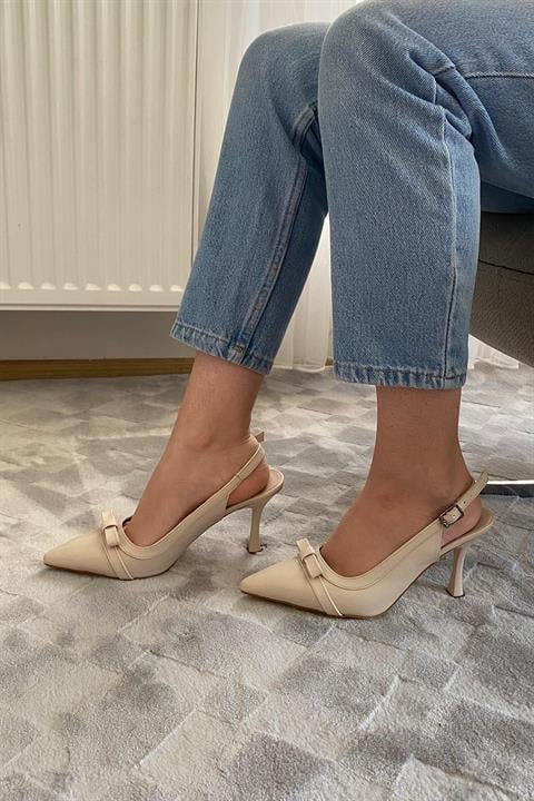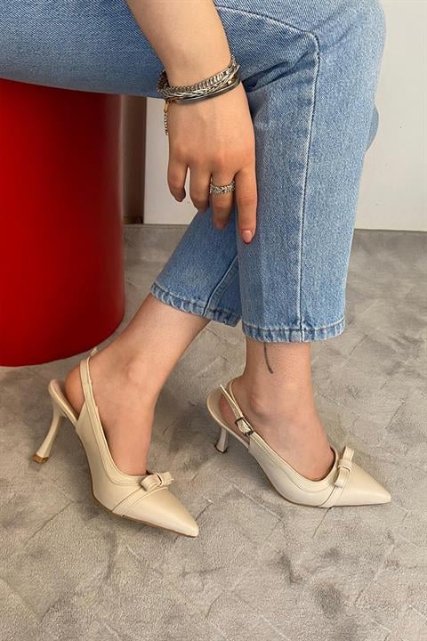 Kadın Madame Krem Cilt Fiyonk Detaylı Arkası Acık 9 cm İnce Topuklu Ayakkabı