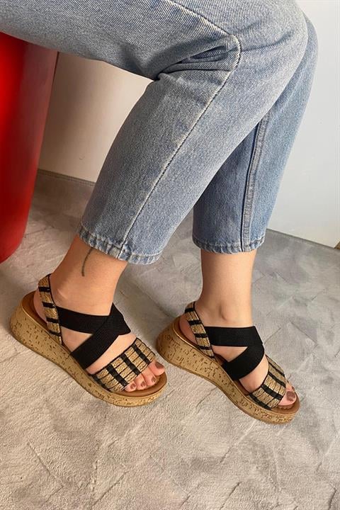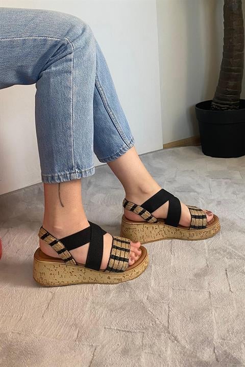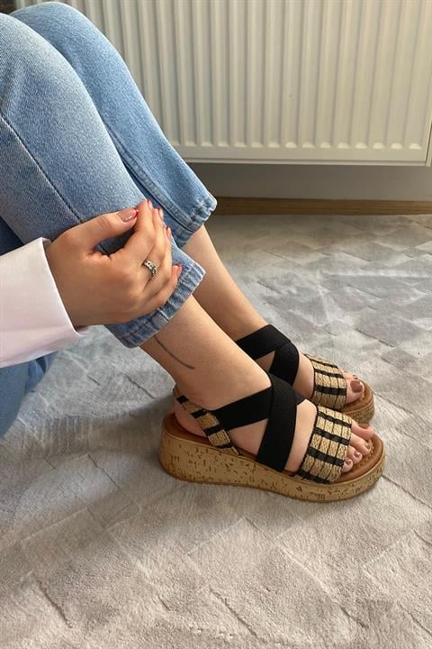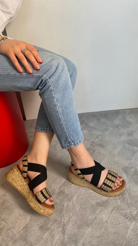 Kadın Margo Siyah Hasır Detaylı Lastilki Kalın Mantar Taban Ortopedik Sandalet K-220