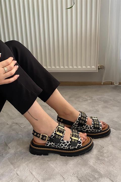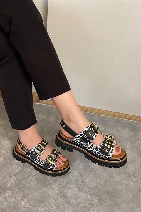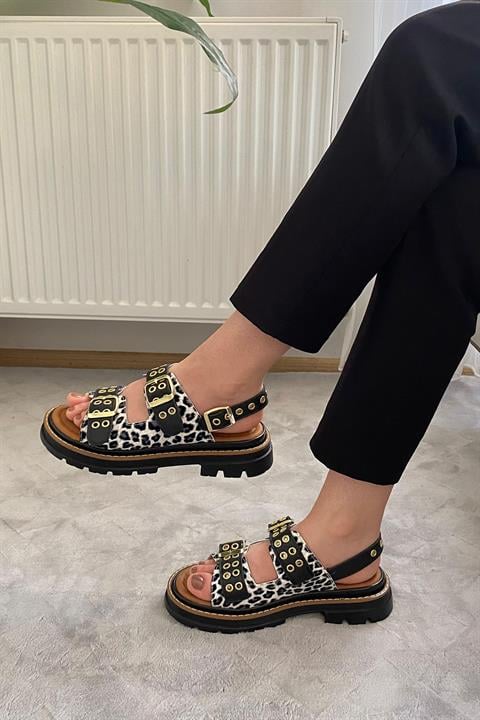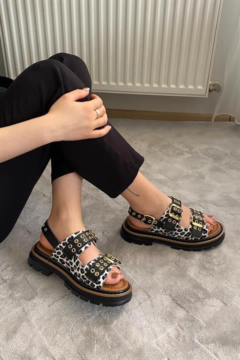 Kadın Mendez Beyaz Leopar Çift Bantlı Kabsül ve Vardola Deyatlı Kalın Taban Ortopedik Sandalet K-120