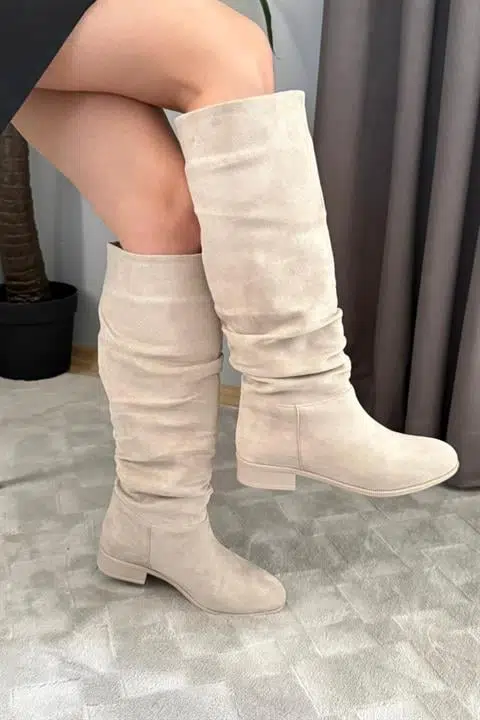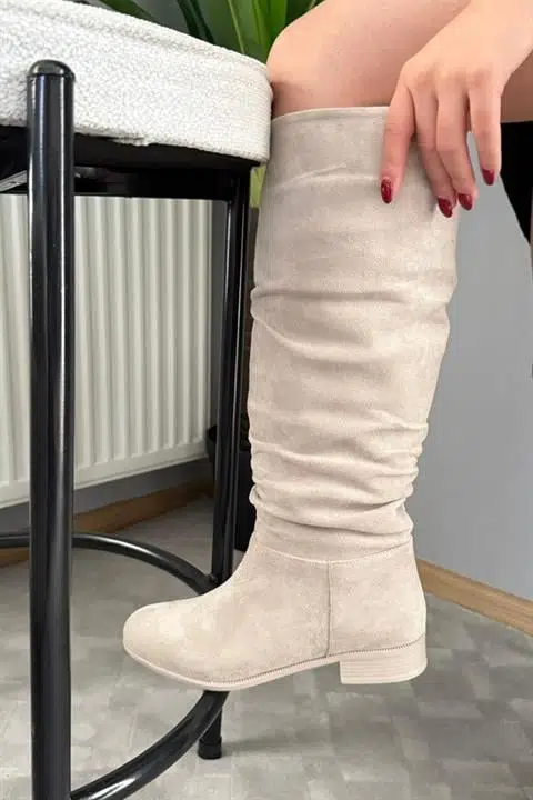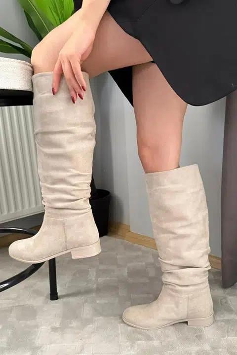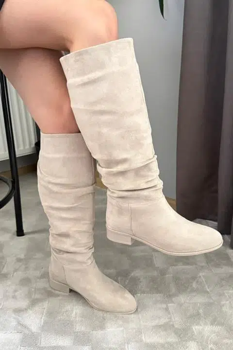 Kadın Mika Bej Süet Düz Taban Büzgülü Diz Altı Boy Çekme Çizme