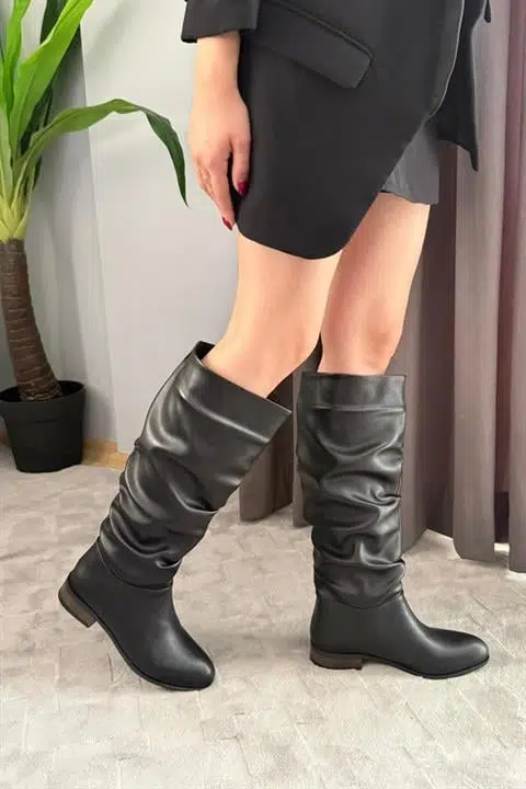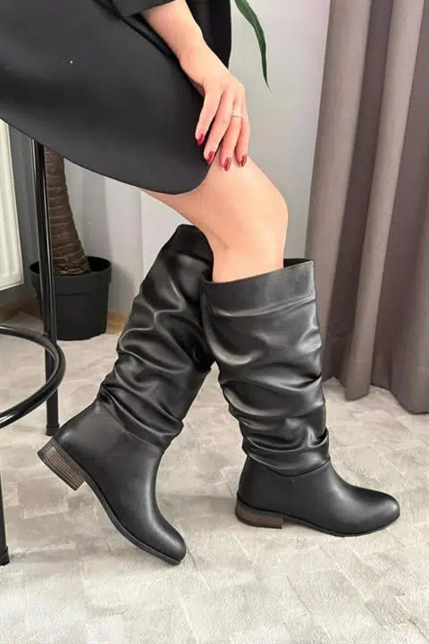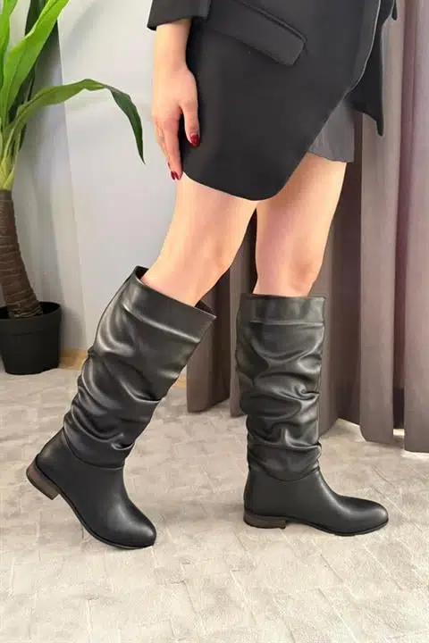 Kadın Mika Siyah Deri Düz Taban Büzgülü Diz Altı Boy Çekme Çizme