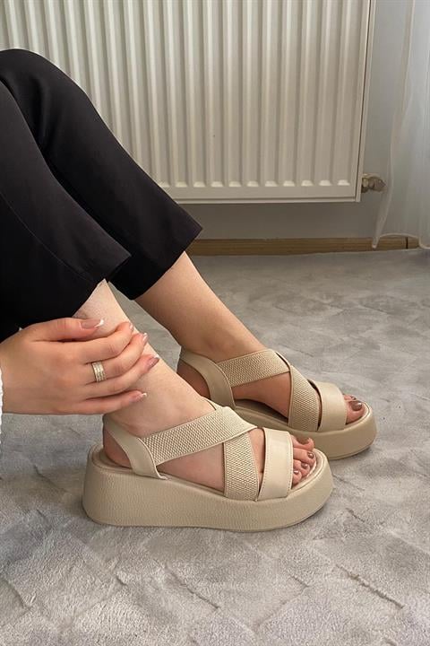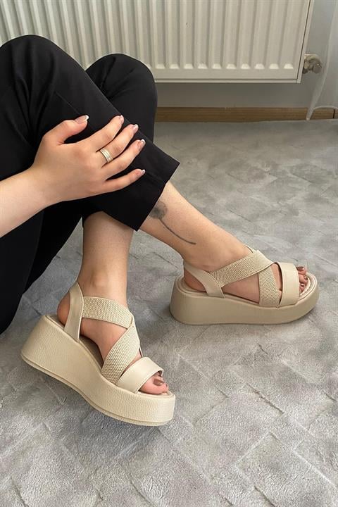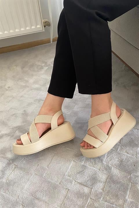 Kadın Mokka Bej Lastik Detaylı Dolgu Tabanlı Sandalet