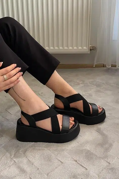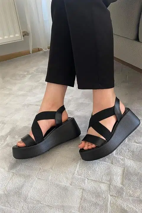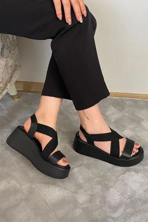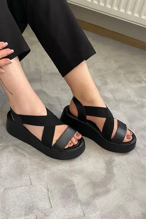 Kadın Mokka Siyah Lastik Detaylı Dolgu Tabanlı Sandalet