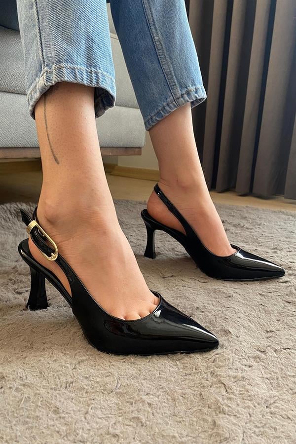 Kadın Motto Siyah Rugan Sivri Burun Arkası Acık 8 cm Topuklu Ayakkabı