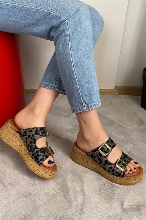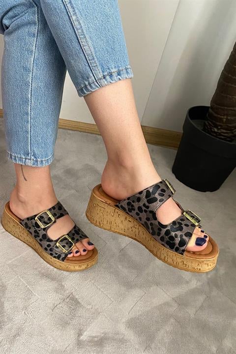 Kadın Nora Siyah Leopar Çift Bant Kalın Mantar Taban Ortopedik Sandalet Terlik K-270