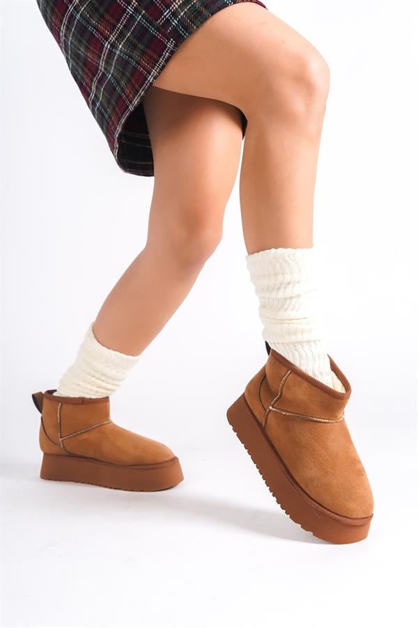 Kadın Palermo Taba Süet İçi Kürklü Kalın Tabanli (4,5 cm ) Mini Kısa Bot