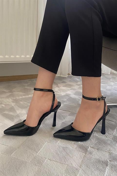 Kadın Persi Siyah Rugan Bilekten Bağlamalı 10 cm İnce Topuklu Ayakkabı