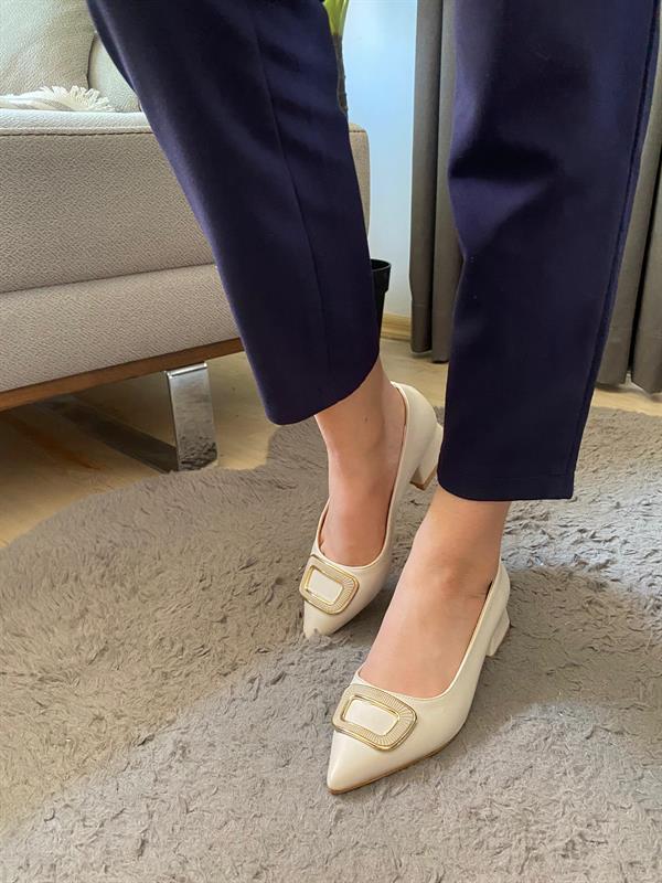 Kadın Pita Krem Deri Tokalı Stiletto Alcak Ökçe Abiye Ayakkabı