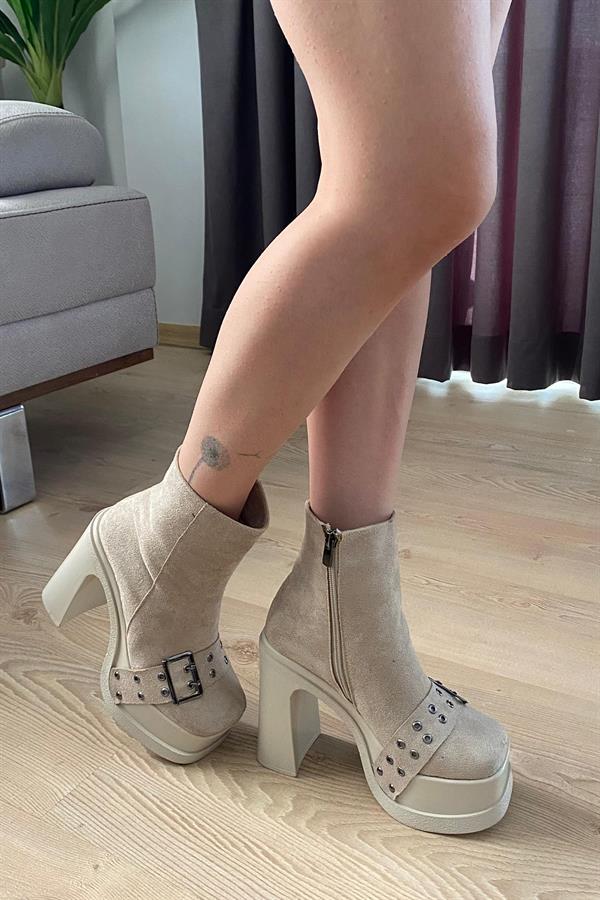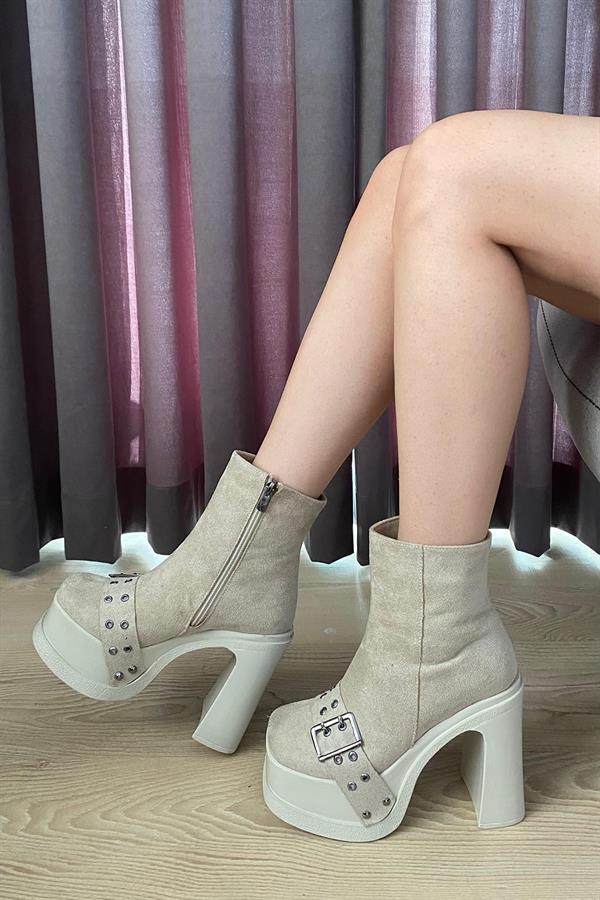 Kadın Sidney Kırem Süet Toka Detaylı 12 cm Platform Topuklu Fermuarlı Bot