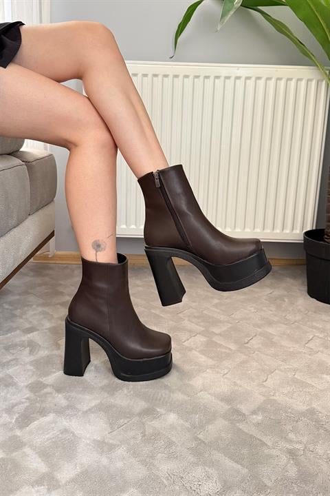 Kadın Nomire Bej Deri Büzgülü Sivri Burun Kalın Topuklu Bot