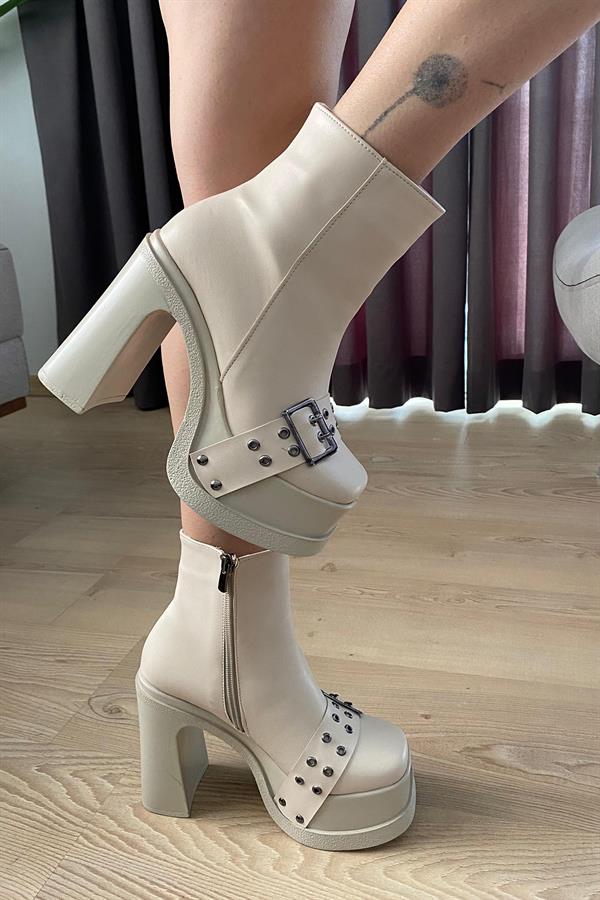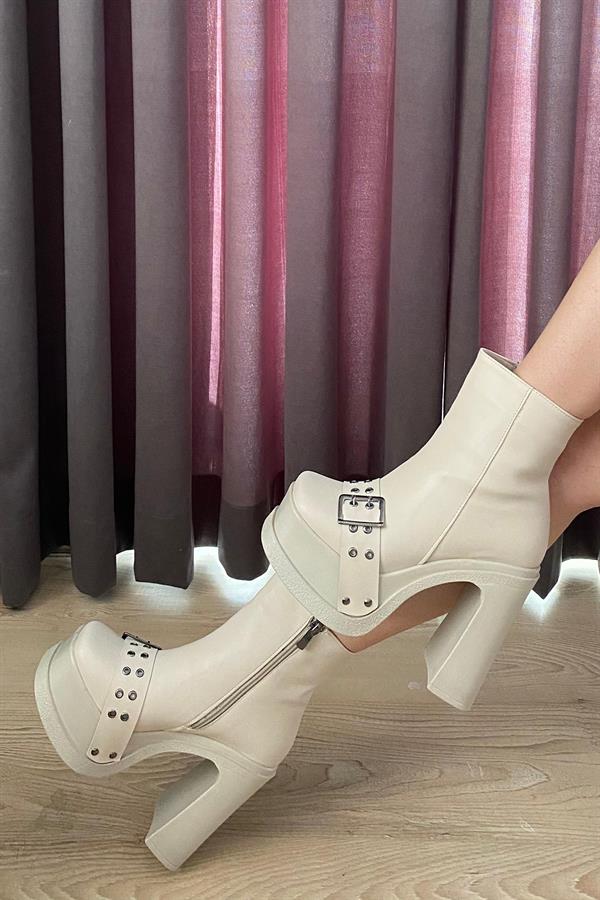 Kadın Sidney Krem Cilt Toka Detaylı 12 cm Platform Topuklu Fermuarlı Bot