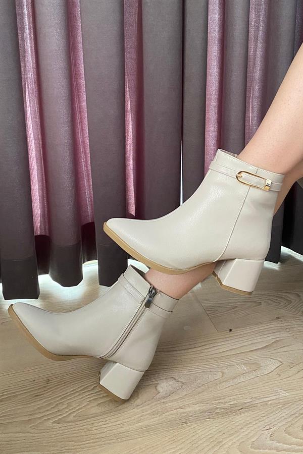 Kadın York Krem Cilt İnce Tokalı ( 6 cm ) Topuklu Sivri Burun Bot