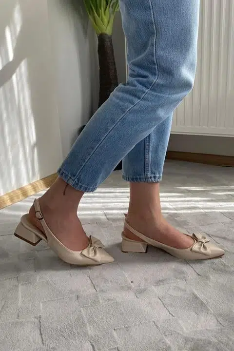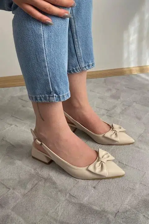 Pola Krem Cilt Arkası Acık Sivri Burun Fiyoklu Detaylı 4 cm Topuklu Ayakkabı
