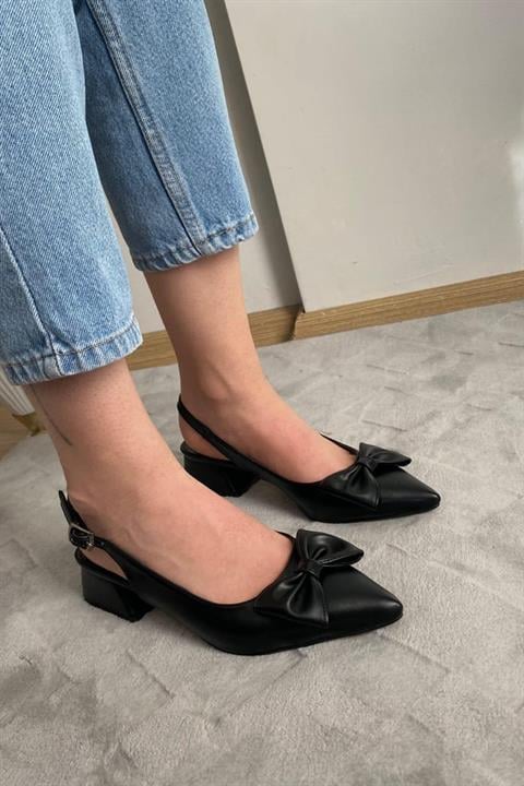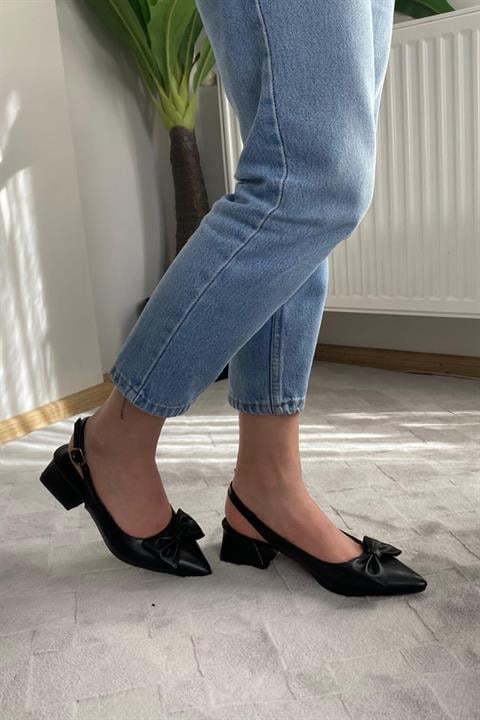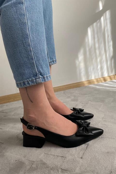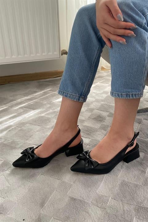 Pola Siyah Cilt Arkası Acık Sivri Burun Fiyoklu Detaylı 4 cm Topuklu Ayakkabı